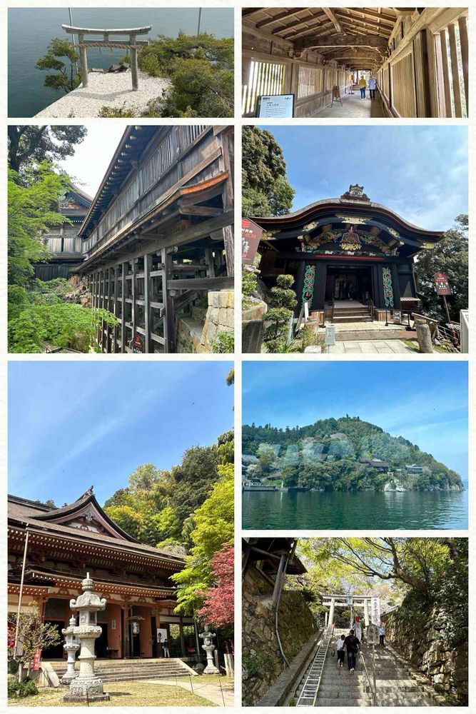 とても小さな島にお寺と神社「都久夫須麻神社」が廊下で繋がってます。願い事を書いた瓦投げをしましたが⛩️まで届きません😅