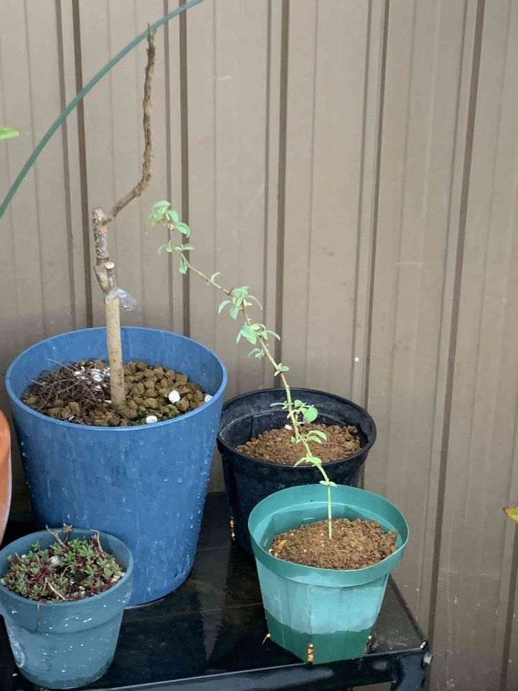 ブルーベリーの剪定した枝を寄せ植えの隙間に挿しておいたら葉っぱが出て来たので空いてた鉢に移しました。写真にないのも含めて3本3鉢。
