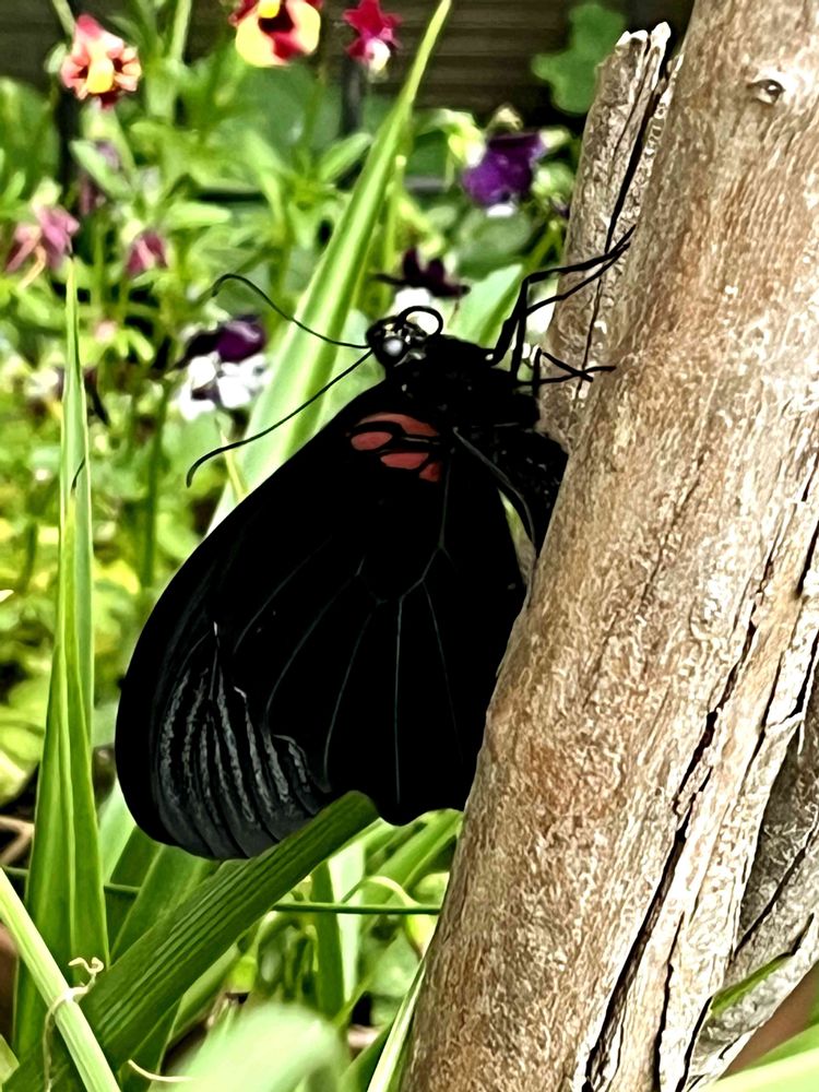 赤い紋様のある黒いアゲハ蝶は あまり見かけたことがありません。