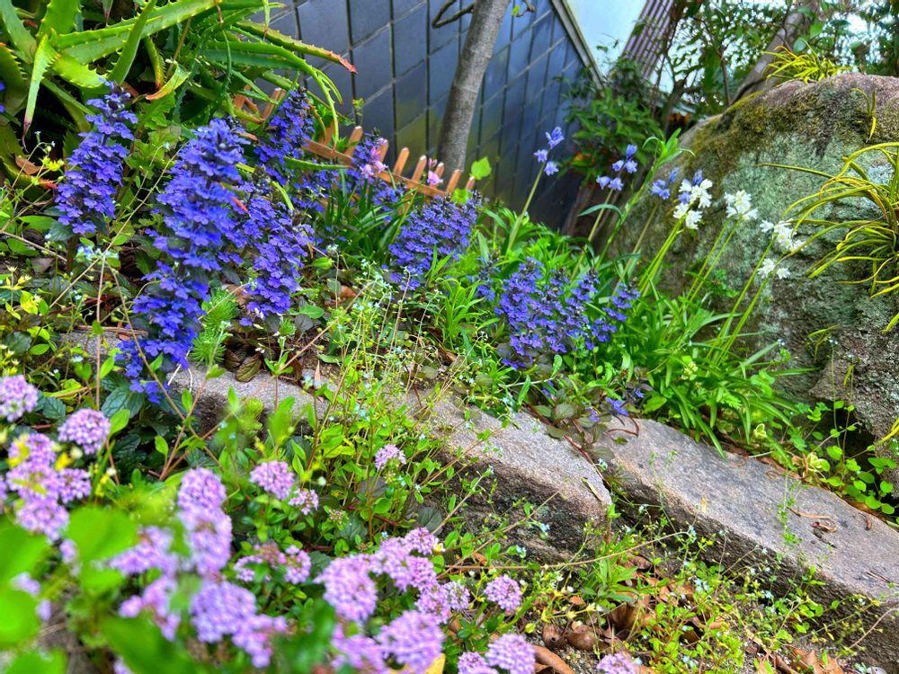 私もアジュガが大好きで、義父から譲ってもらったアジュガを何年もかけて増やし、小道沿いに植えてます。