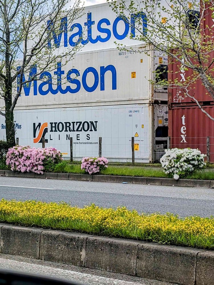 ツツジは反対車線。中央分離帯には黄色い花が沢山。