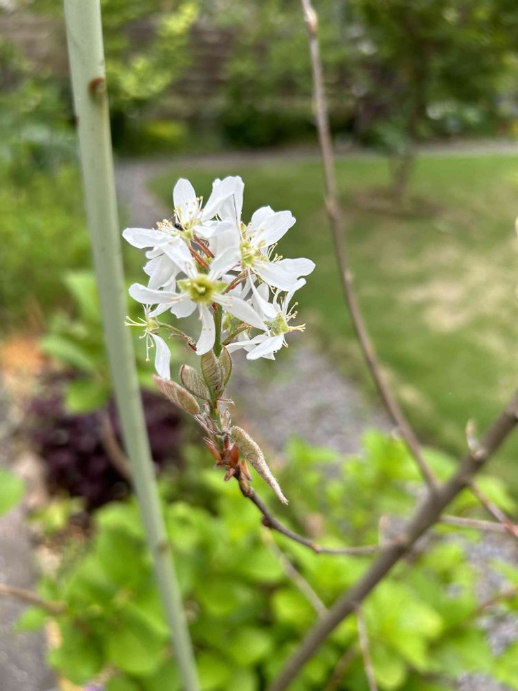 ジューンベリーの花が初めて咲きました。植えて今年で3年目かな、背丈は2メートルくらいになった。