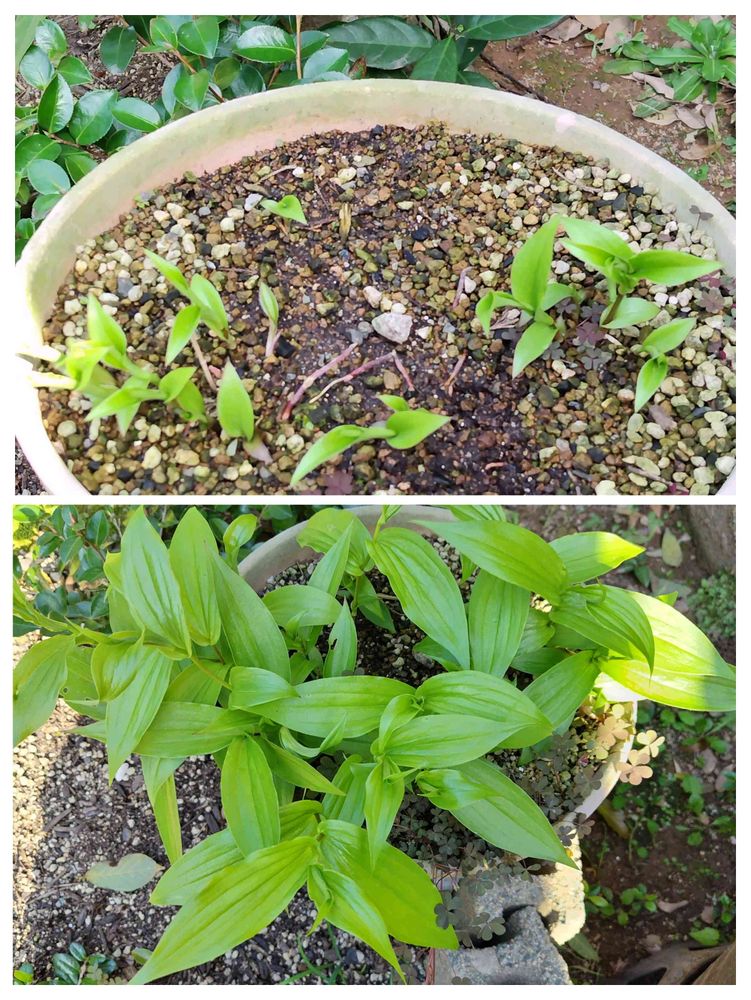 弱りかけたギボウシを空いていた鉢に植え替えた。復活することなく時が過ぎ、春になり、ニョキニョキ出てきた芽🌱は2年前に植えて上手くいかなかったキイジョウロウホトトギス!ものすごい勢いで成長中🌿🌿