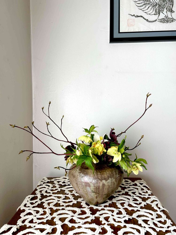 大地を思わせるどっしりとした花瓶とのハーモニー、春の喜び伝わりました。