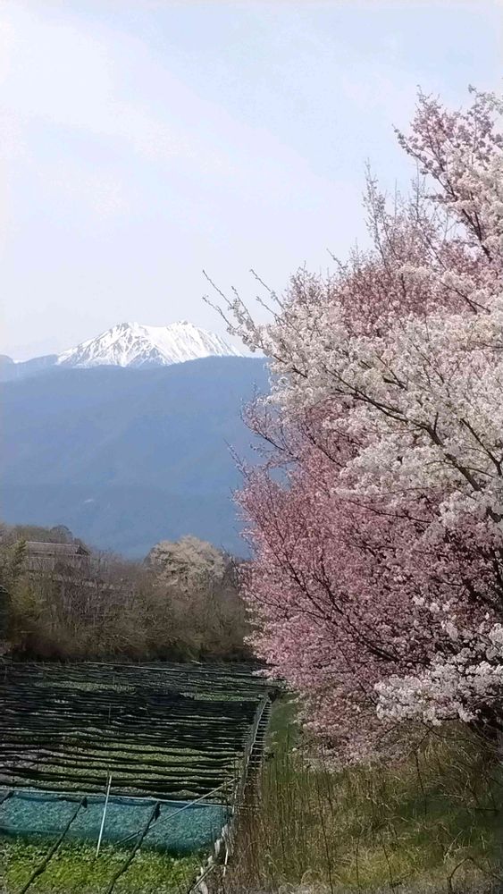 おはようございます😊散歩コースの北アルプス常念岳とワサビ田と🌸桜です。