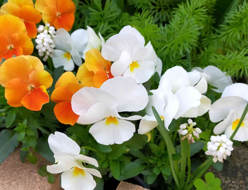 ①よく咲くすみれの間から白いムスカリが✨かわいい😍