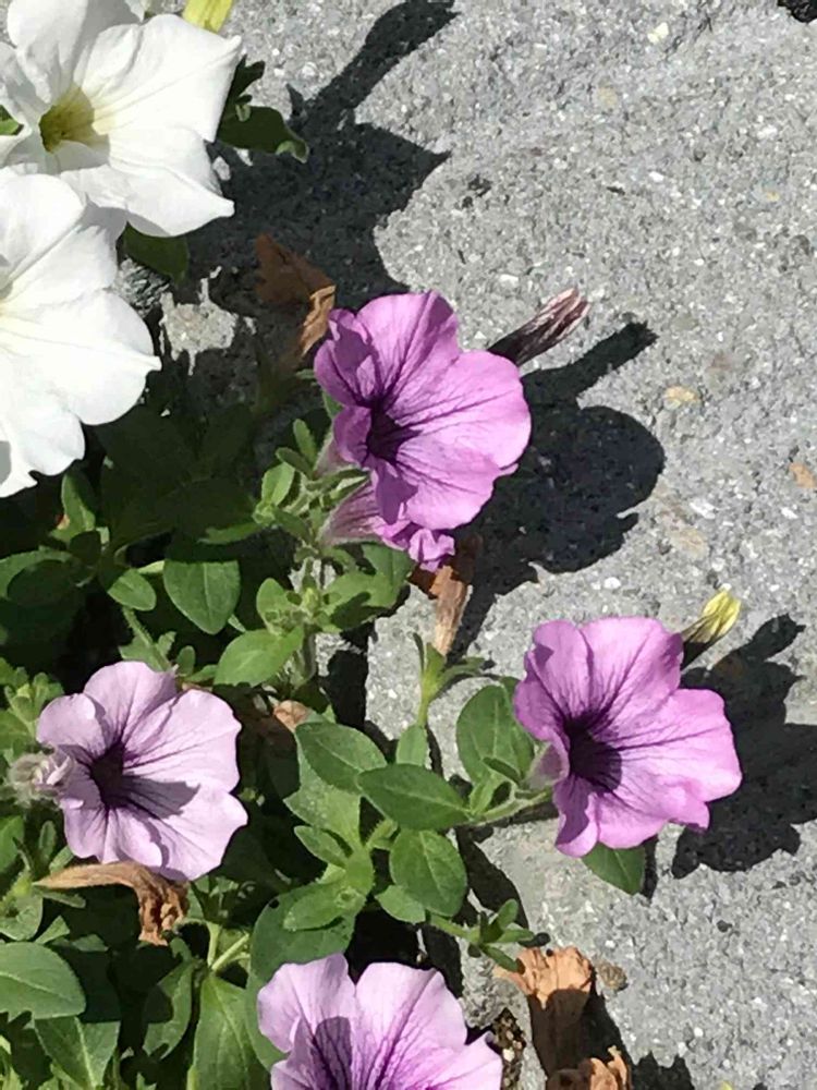 真夏の日差しに負けないで力強く咲いているペチュニアさん達。みんなお日様の方に向いています。