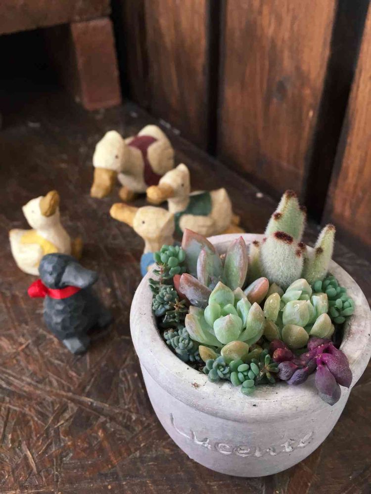 もう10年ぐらい前に買ったあひるさん家族の雑貨と、セリアの鉢に小さな寄せ植え♥︎︎∗︎*