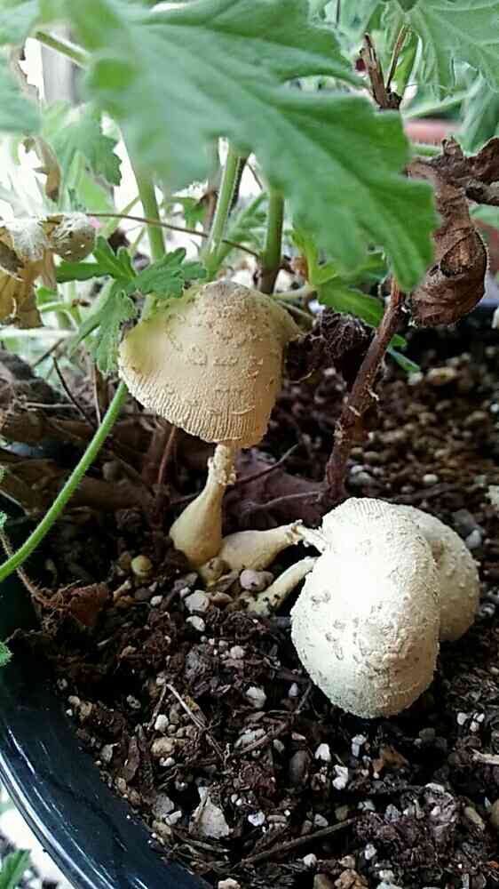 ローズゼラニウムの鉢、枯れた葉っぱを取り除こうと根元を見たら、キノコ?が何本か生えてました💦