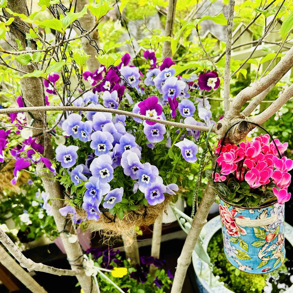 ありがとう♥️メルカリでハンドメイドしてる人のリメイク缶を買って、プラ鉢スポッと入れてるだけ〜🤣缶軽いからハンギングにピッタリなの🤍