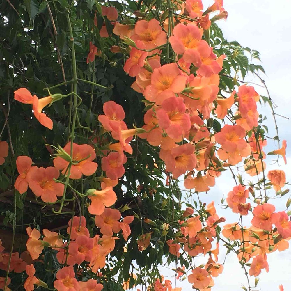 もしお時間あったら昨年の7/15にも2枚あげてます。そのうち1枚は、このノウゼンカズラの棚の全体像です。風になびいて凄かったです🧡🧡🧡