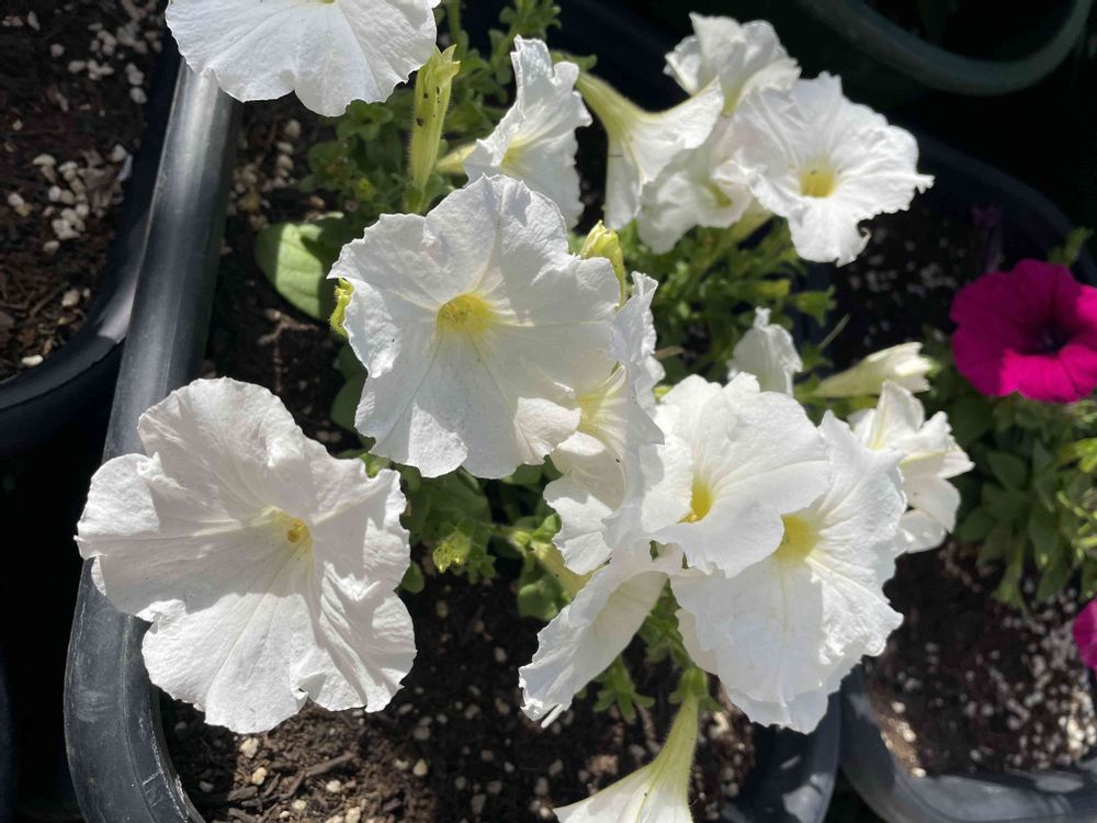 令和6年4月17日(水)🌫️曇り おはよー^_^ございます ヒヨドリ被害にあったペチュニア🤭 咲いた花を摘むのが苦手な自分に代わって 花を沢山咲かせる為🤣だった? 水曜日 白いペチュニア🤍で参加させて下さい👩🌾🧑🌾👨🌾