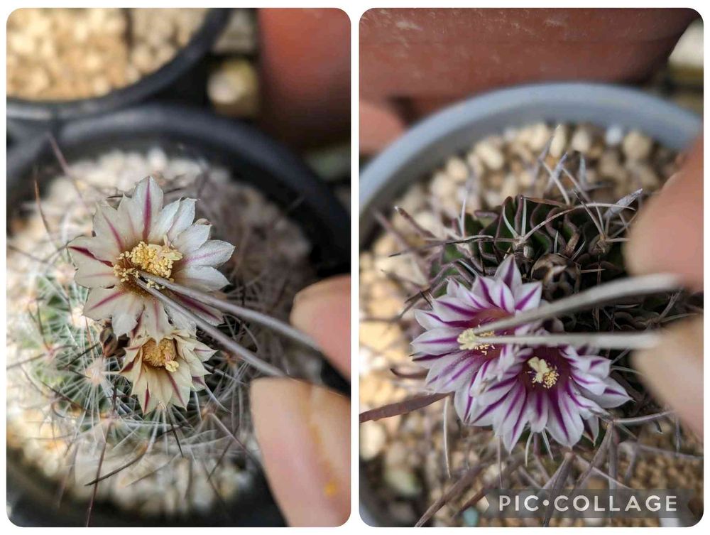 4枚目、逆に秋陣営の雄しべをピンセットで切り取って、縮玉の雌しべにちょこん🤗🎶🎶