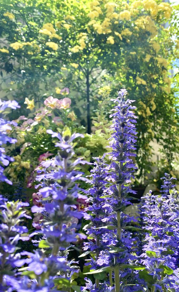 モッコウバラの黄色とアジュガの青のコントラストが大好きな季節です🌱
