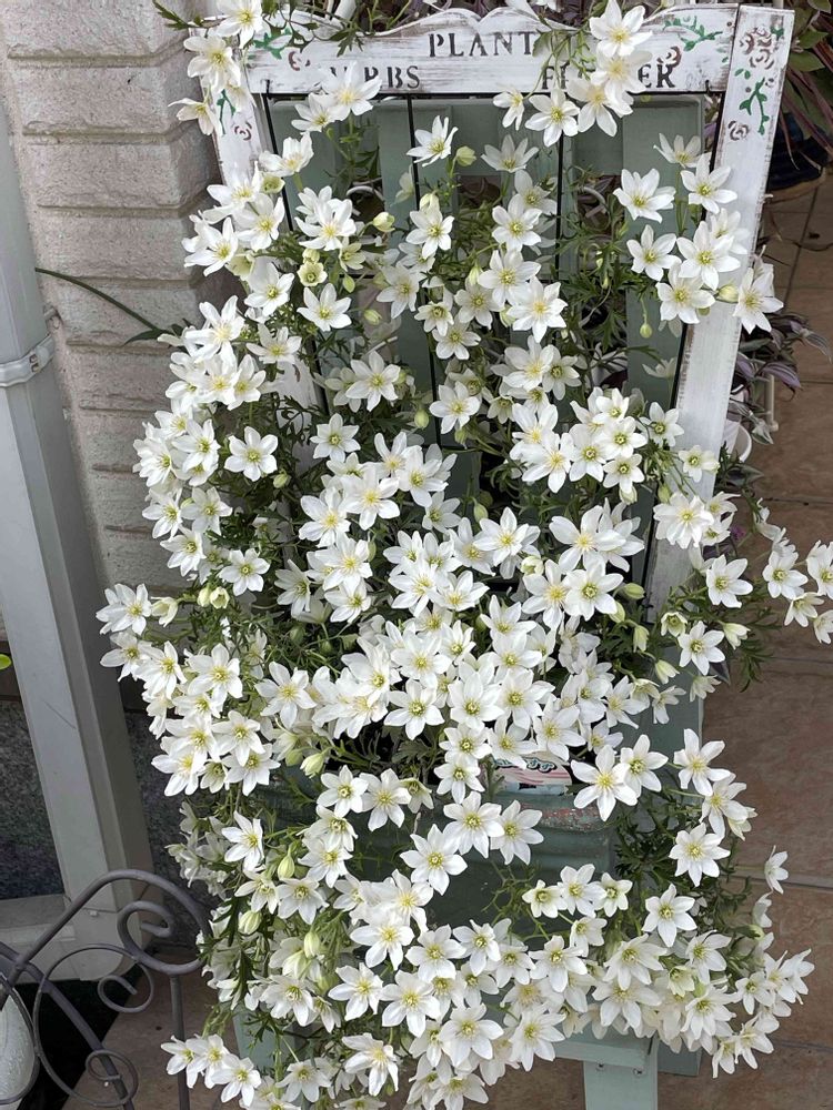 クレマチスも初心者で🔰去年の行灯仕立てが小さくなったので、20cmくらいの角鉢に、マルシェでgetしたフェンスを後ろに立てています。