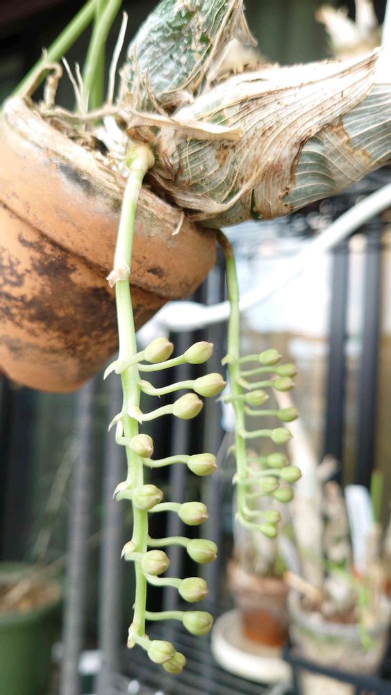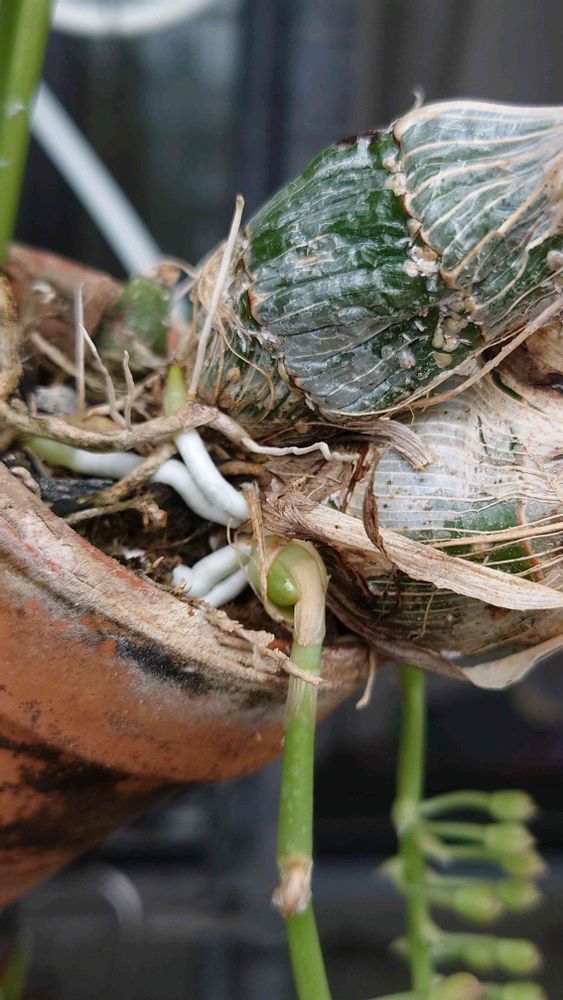 一昨年5月、ベラビスタオーキッドさんから購入したclowesia amazonica。小さな蕾が明るい方を向いてキレイに並んでいて、咲くのをそれはもう楽しみにしてる一方、日々、しけるのではと不安です。このところ東京は気温とそれに伴い湿度も乱高下していて。さらに、花芽から新しい根が出てきて、今さら新芽に変わってしまうのかと思ってたら、花茎のすぐ下に新芽発見(2枚目)。これ、もう今年は咲くのは止めて、新芽を伸ばそうとしてるのでしょうか。花が見たい…。