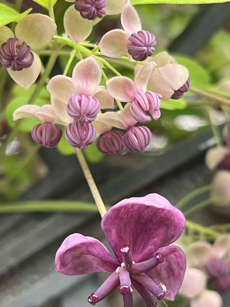 裏のフェンスに三つ葉アケビが絡まっていて、濃いエンジの花がたくさん咲いています😊