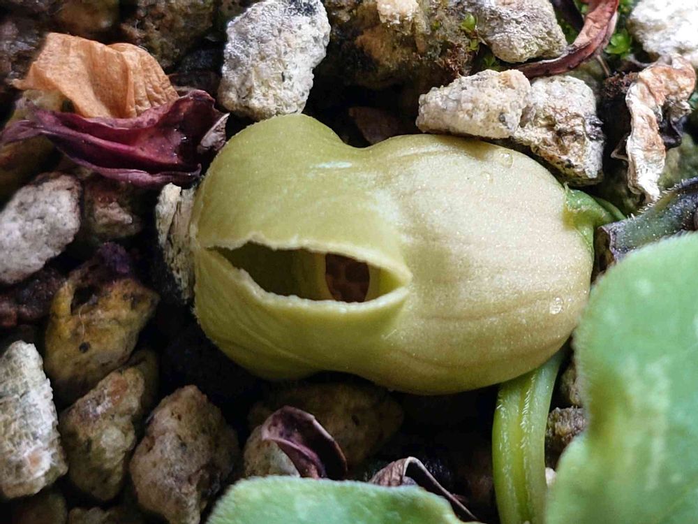 ③裂けた部分が反り返り、丸い入口(中に雄蕊、雌しべがある)が見え、開花する。