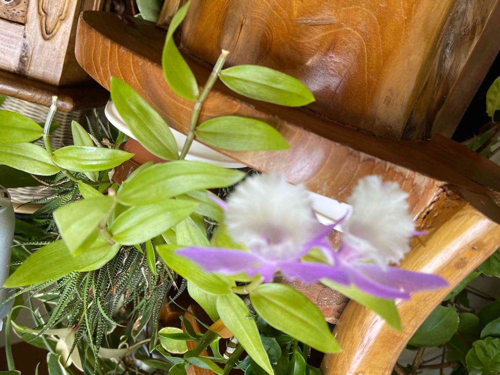 小さくて、可愛い花です。蘭の種類かなと思いますが。花はカトレアに似て、葉っぱが特徴的?葉っぱが伸びて下がりその先に花をつけています。
