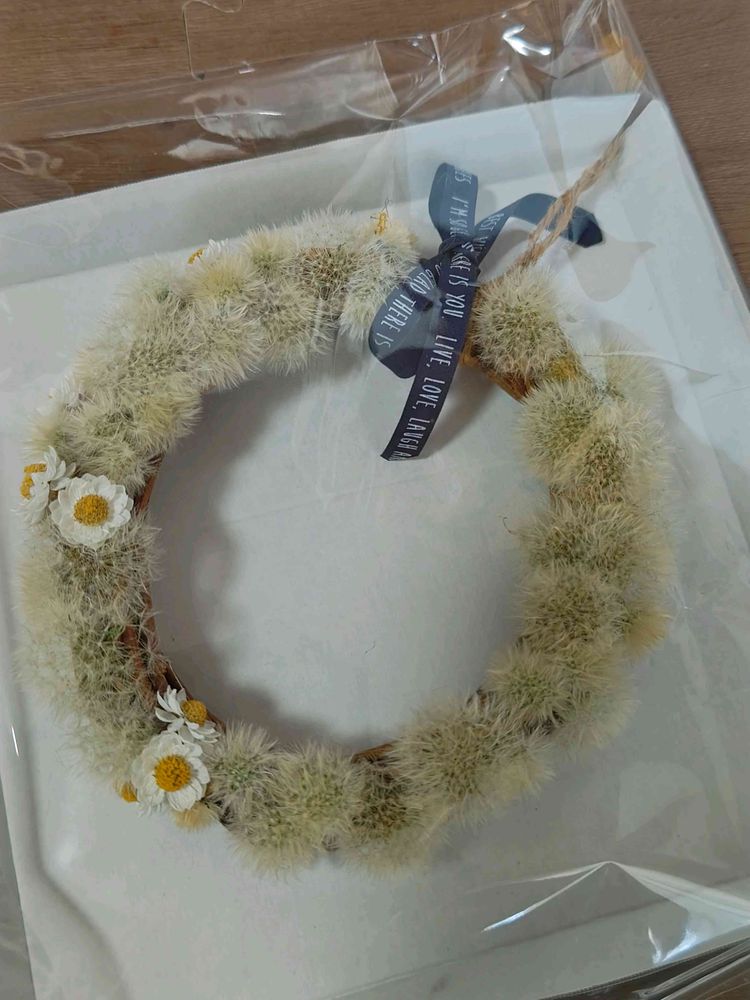 いつもの綿毛リースに花かんざし。こちらはラッピングして🎁。4枚目は、3枚めの開く前の様子。