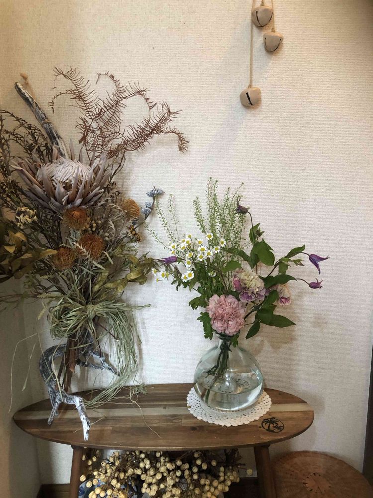 流木アレンジも花瓶もお花も楕円形の台もみーんな好き😍