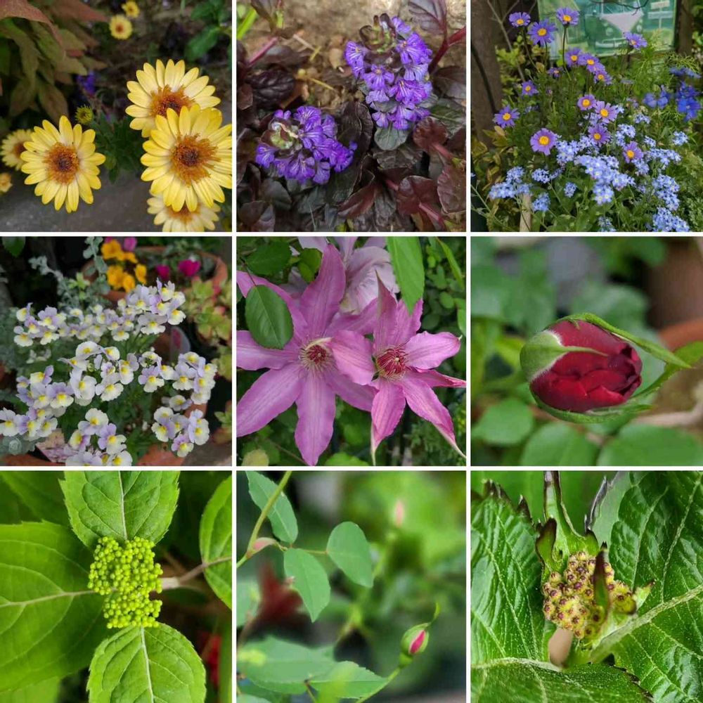 庭の草花🌼🌱🌹 オステオステムマム、アジュガ、クレマチス、青い寄せ植え……。アジサイにも蕾が🙌