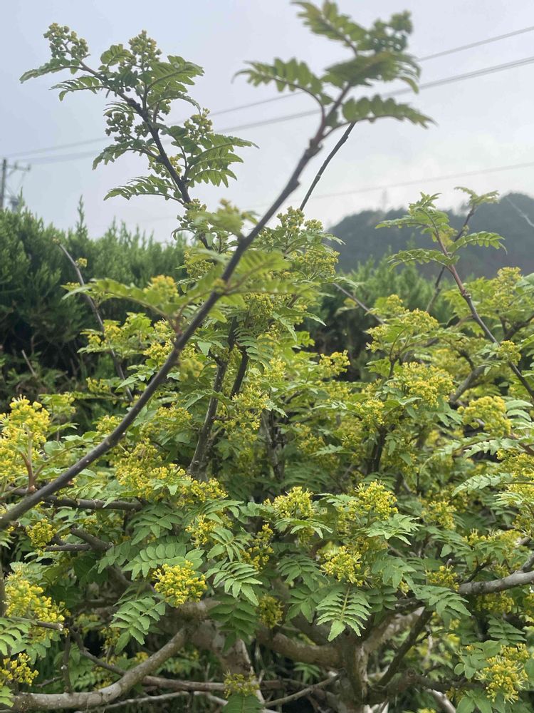 葉の脇に黄色い花を咲かせている山椒の木🌿