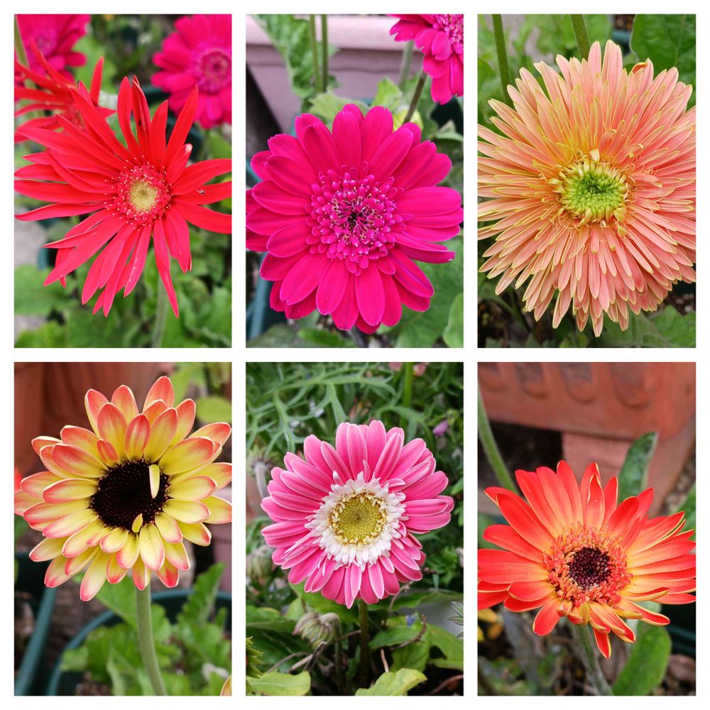 左上の赤くて細めの花弁のが原種だと思われます。昔はガーベラと言えばこれしかなかった(笑)派手ではないせいか?多分園芸店では売られていません。古いお家には有るかも~🧐😆