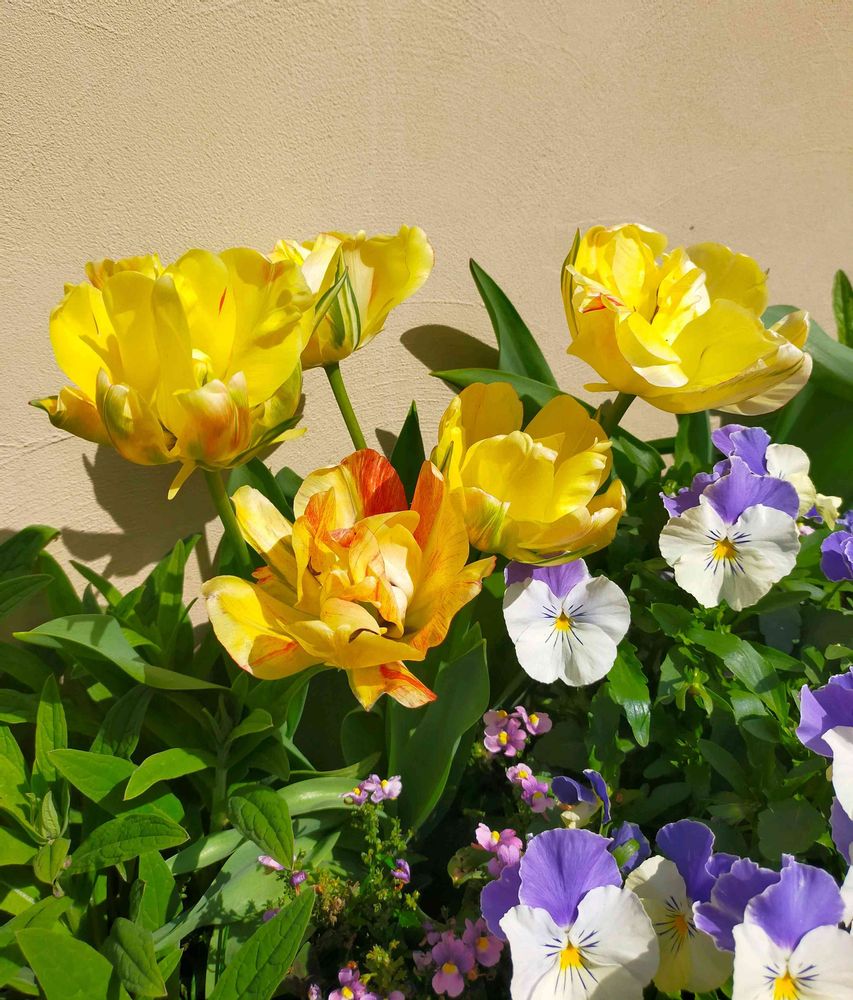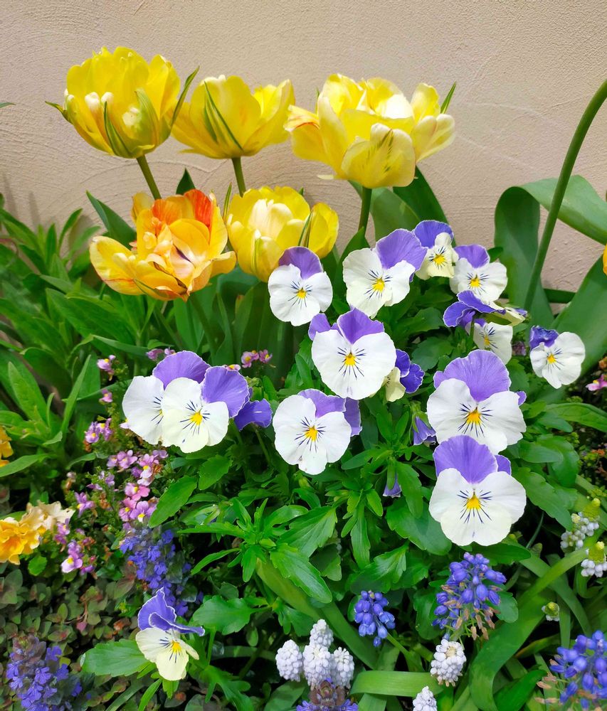 門柱前の小さな花壇。2種類のチューリップを植えたのですが、時間差で咲いたため、コラボできませんでした😢チューリップも早咲き遅咲きがあるので、開花期を合わせるのが難しいですね💦