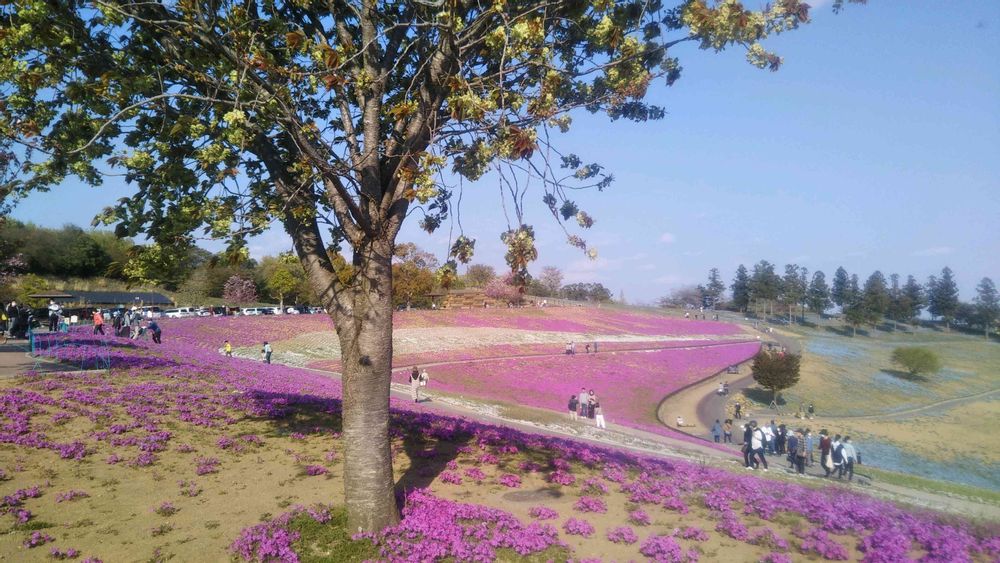 北関東自動車道沿いで圧巻のピンク色と青色の丘ですね。ネモフィラは、ひたちなか海浜公園ほどではないですが、杉の木バックに撮影がオススメです。