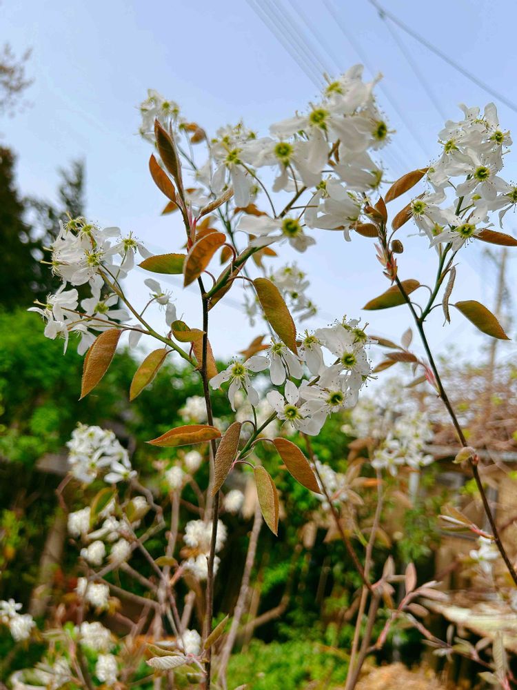 ❸ 『ジューンベリー』の花が咲いてきた。鉢植えで育てているものから落ちた実から芽生え、昨年はわずかだった花が今年はたくさん咲くようになった😊