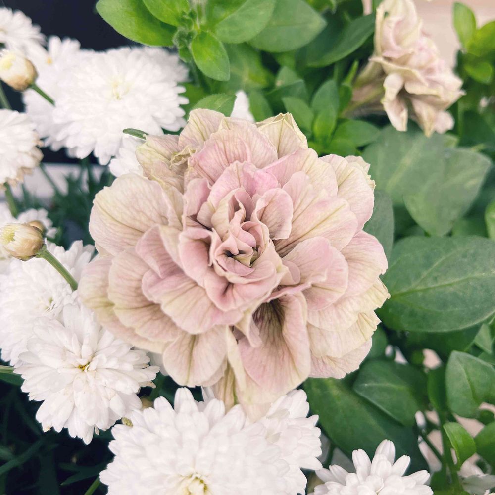 おはようございます☀風が強いです〜🌀また玄関掃除が、、、😨笑 こちらは一目惚れ!ペチュニアホイップマカロンのモカモンブランという品種です🌸もう色味がドンピシャでした🥰