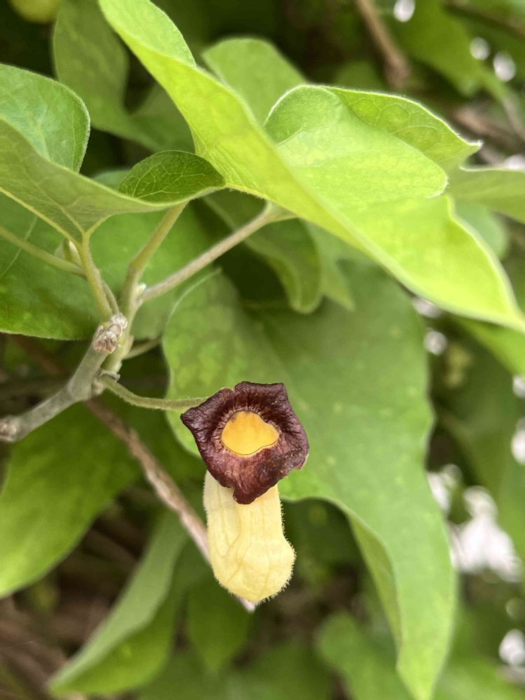 ウマノスズクサこのコがアーチにぶら下がってるの😳