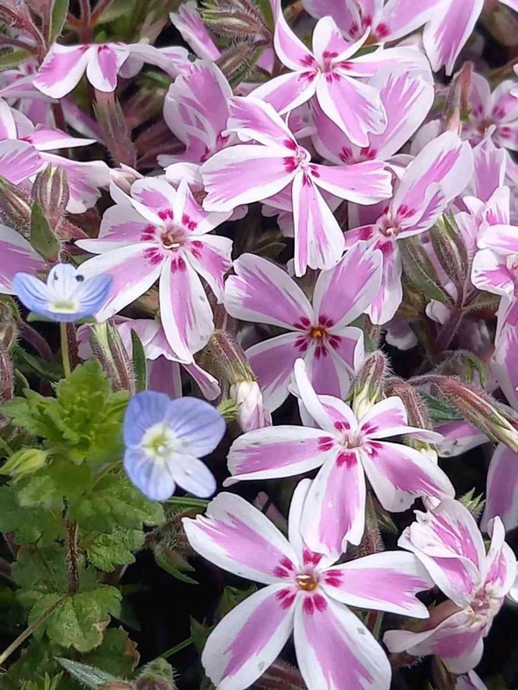 ①キャンディストライプ?多摩の流れ…どちらかな?オオイヌフグリも一緒に💕💙 市民農園の縁に溢れる様に咲いてます✨ ピンクのストライプにドきゅん💘
