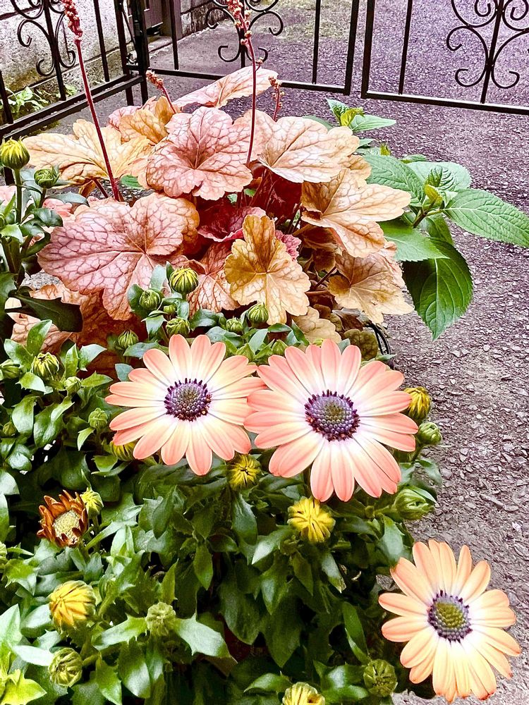 オスティオスペルマムの開花が始まり、シナモン カラー同士、ヒューケラの隣りに移動してコラボしました😊