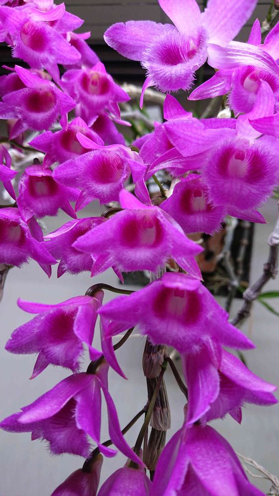 デンドロビュームは洋ランでも丈夫な方で、秋まで外!10度以下の日を10日位、外で管理すると花芽を付ける様に成ります。10日立ったら、家の中で管理、乾いてら水と霧吹き❗