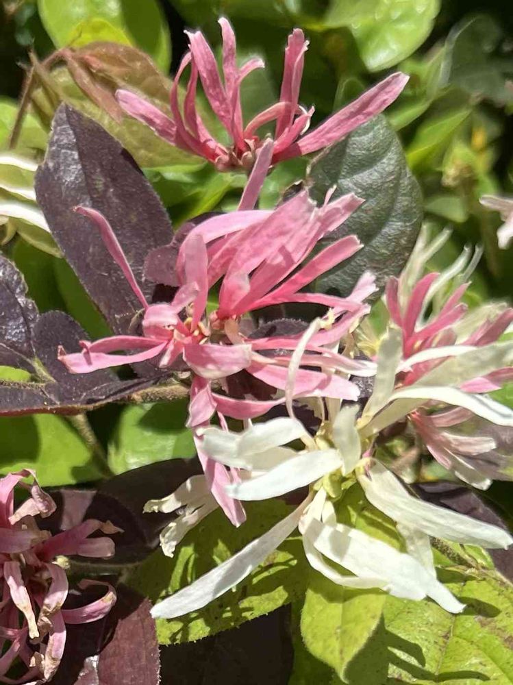 マンサクのお花、紅白で寄り添って微笑ましい花姿です🤗