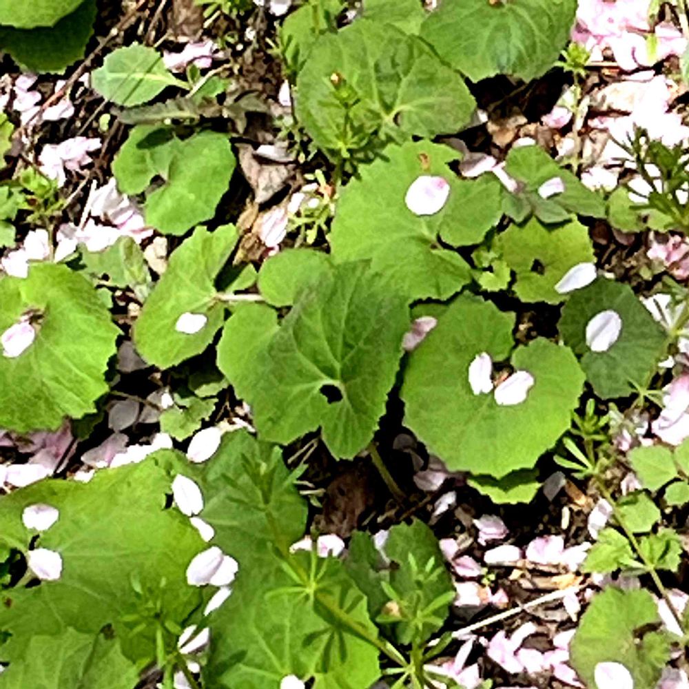 桜の花びらがひらひらと地面に落ち、足元を見たら、小さいフキがいっぱい!