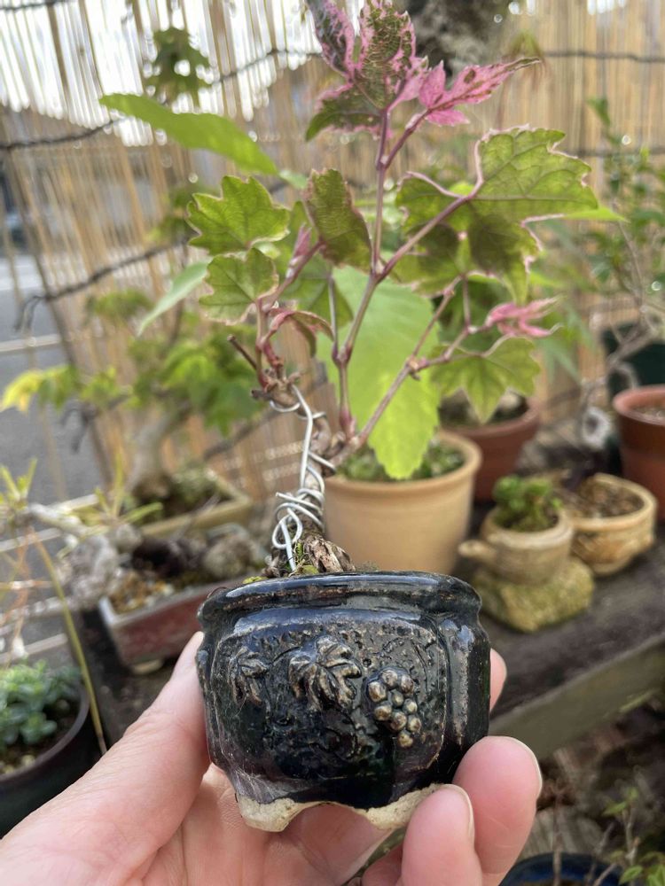 すごく頑張って彫ったのですが先生のチョイスが黒の釉薬で残念だったのですが斑入りのヤマブドウのピンクっぽい葉っぱと合うかな