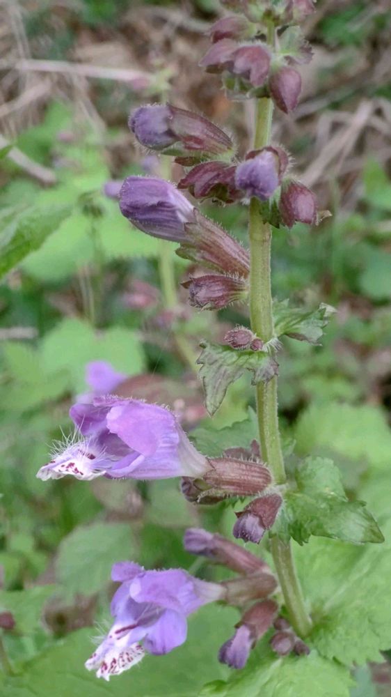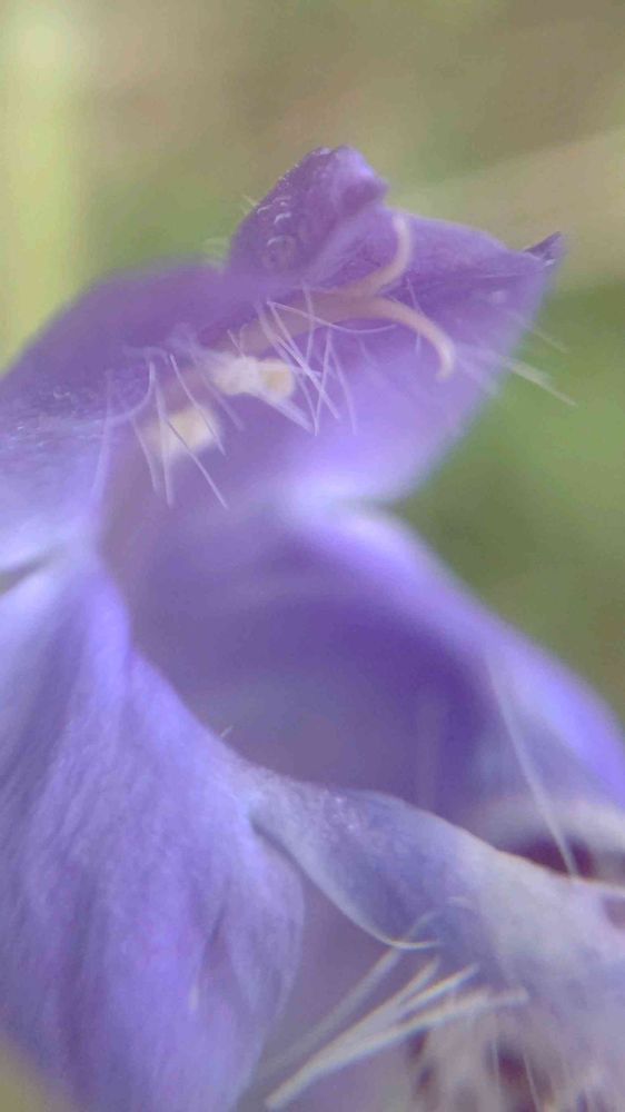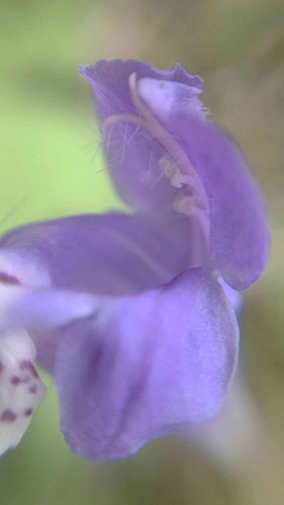 上唇に雌しべと雄しべが張りついていて、雌しべの柱頭は2つに裂け、雄しべ4本は2本ずつ長短に分かれている🌑(2、3枚目) 訪れた虫の背中に花粉をつける作戦やね😃