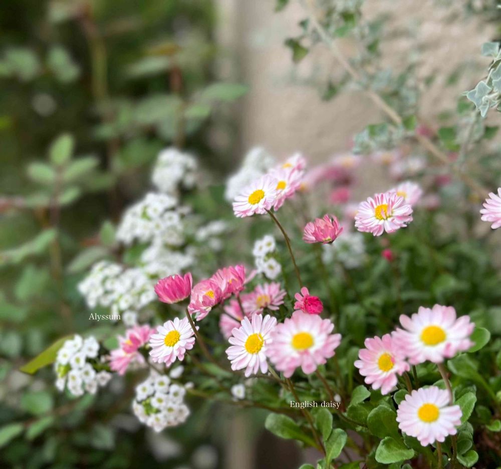 何回かの切り戻しをして、春はまた元気に咲いてくれているイングリッシュデージーとアリッサムです🌸💗株元には、溢れ種からの芽が🌱