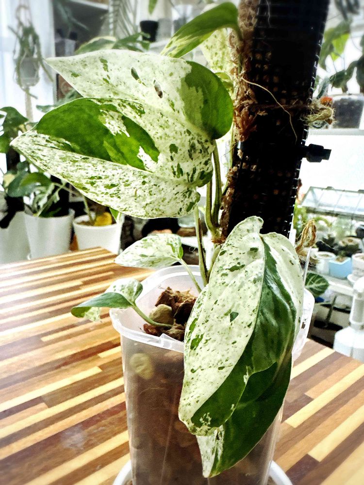 2025.8月に某サイトで購入した【アロカシア チャイ】の 突然変異?なんだろう 購入時、元々有った葉を(1枚目の葉)として、 下から新たな葉が出てきてる状態で到着しました(2枚目の葉) こちらに来て初めて出てきた葉に異変が。。 育て始めて出てきた初めての3枚目、4枚目 (途中から、斑1、斑2、、と続きます) どこまでこの謎の斑入葉が続くのか、 いや止まるのか……記録していきます