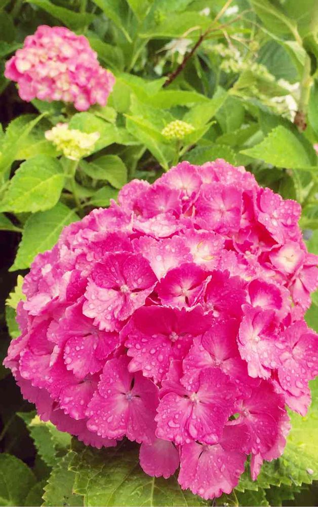 おはようございます☁️💕雨上がり での ピンクアジサイ🌸もりもりして 咲いています🌸ヨコに 見ると ハートの かたちしていますよ〜😄