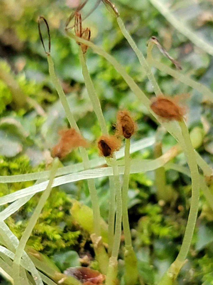 実はこのコケの胞子体を撮るのに気を使い、足場が悪く、葉状体が上手く撮れず同定は出来ていません。苔類のクモノスゴケ科と思います。