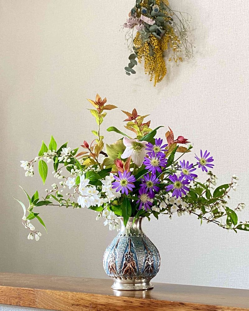 庭の姫うつぎ・しもつけ・都忘れ・クリスマスローズをカットして来て、トルコのお土産の花瓶に挿しました。いつもの拙い短歌を添えて・・😥