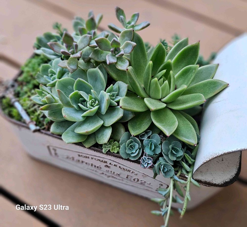 先日、多肉のマルシェで購入したブリキ缶に寄せ植えした大きめの多肉達。
