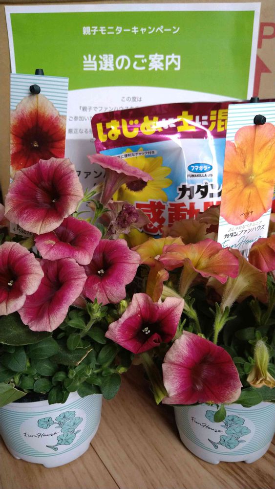 ペチュニア ファンハウス花苗2ポット モニター当選させていただきました!感動肥料もいただきました✨うれしいプレゼント🎁に、子供たちも、かわいいなぁ~❤と、大喜び!どこに植えるん?と、早速、飛び交う疑問!?鉢を、探さなくっちゃ!土を買わないと!と、楽しみが、また増えました。フマキラーさま、グリーンスナップさま、本当に、ありがとうございます✨