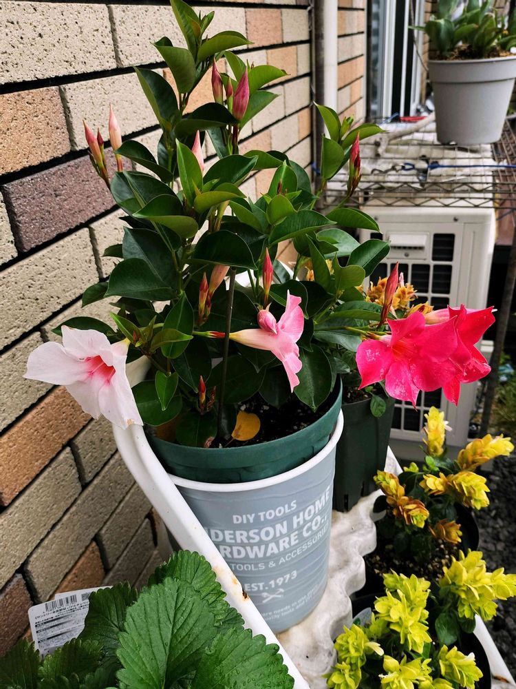 マンデビラが地道に咲いてます。桜 松月もまだまだ頑張っています。昨日咲いたハイブリッド芍薬 ヒラリーは少しずつサーモン色が入ってきました。