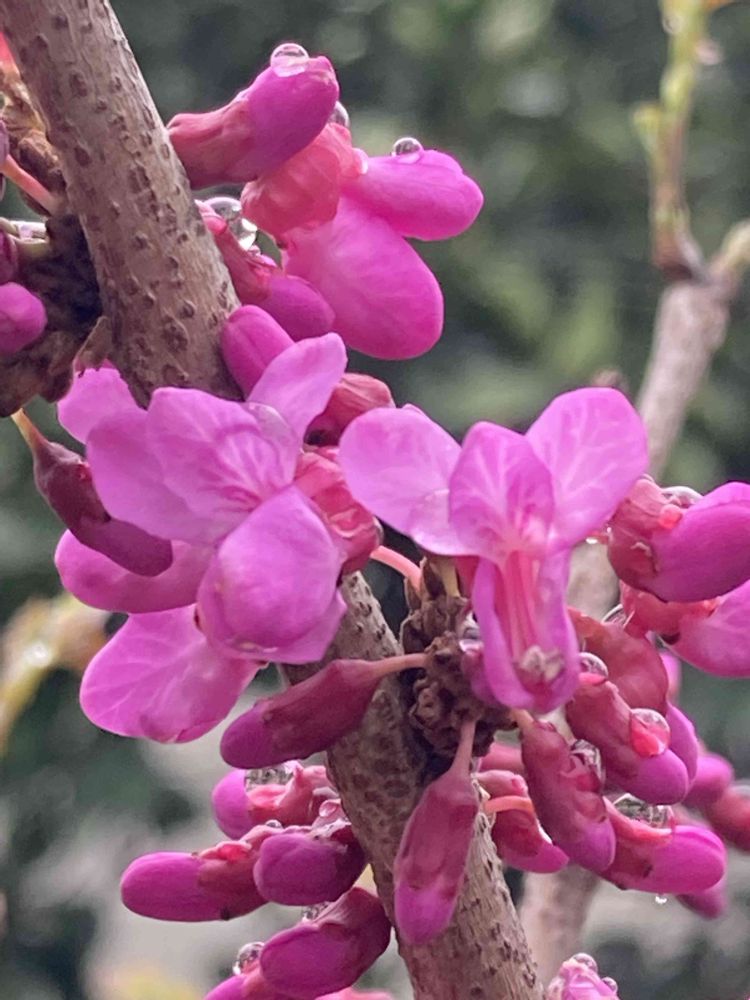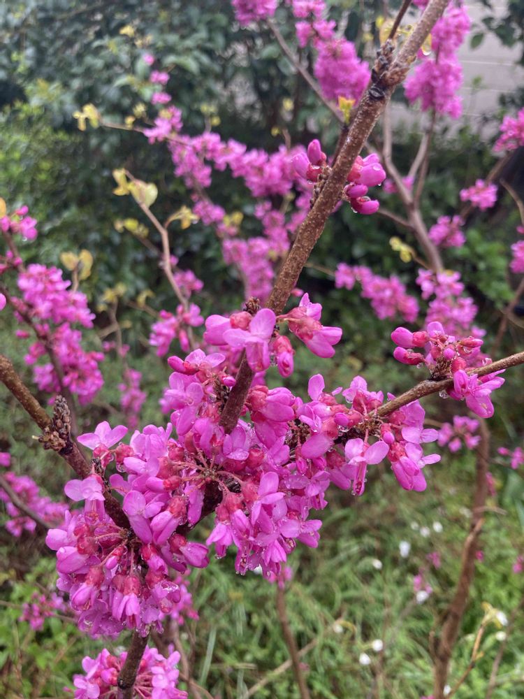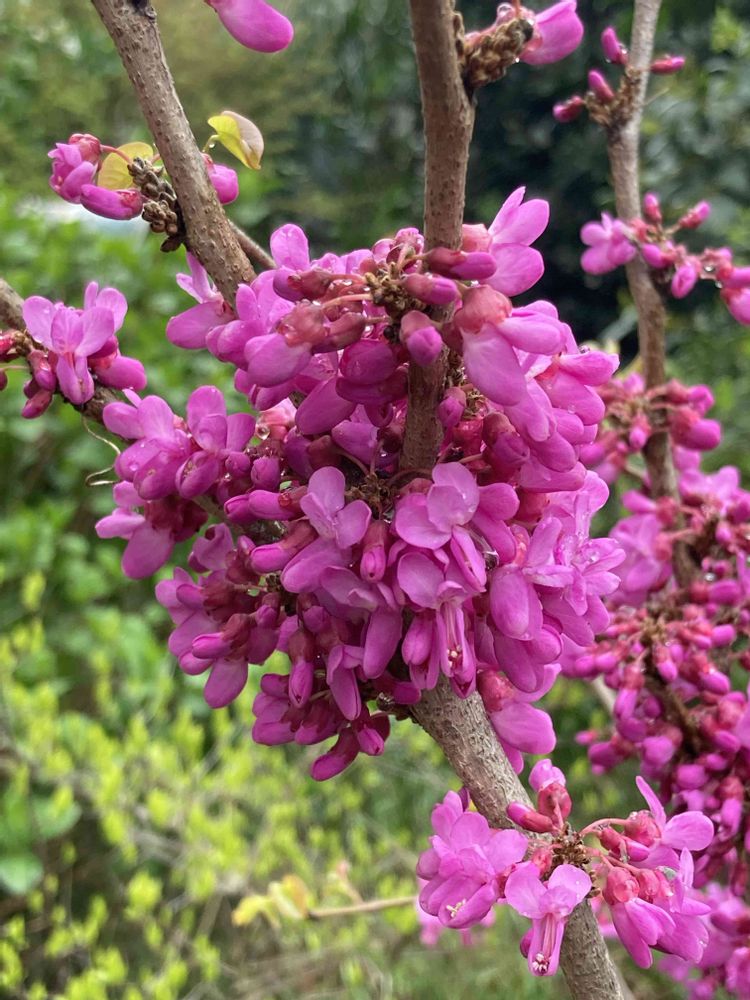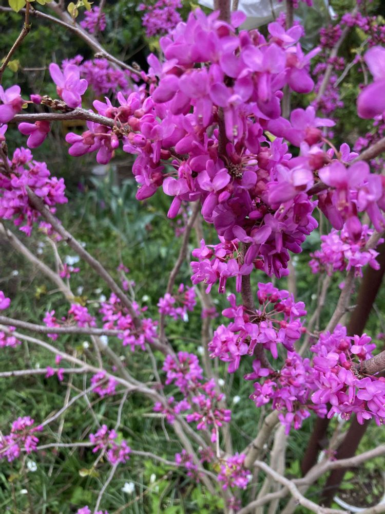 こんにちは😃今日のお花、ハナズオウ。放ったらかしガーデンにて。4/6pic。今は葉っぱ🌿モリモリです👍😃🎶