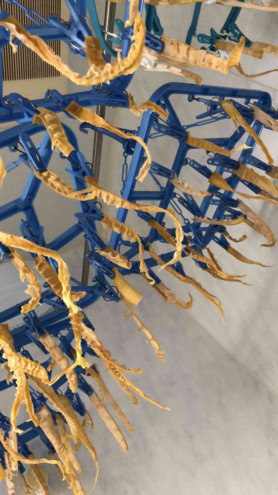 取り出して、触れるくらいになったら、縦に8等分して、洗濯物干しにぶら下げて。